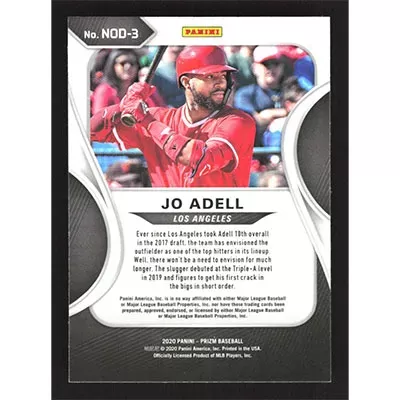 This is a 2020 Panini Prizm Now On Deck Jo Adell baseball card. The card is #NOD-3 and pictures show condition.