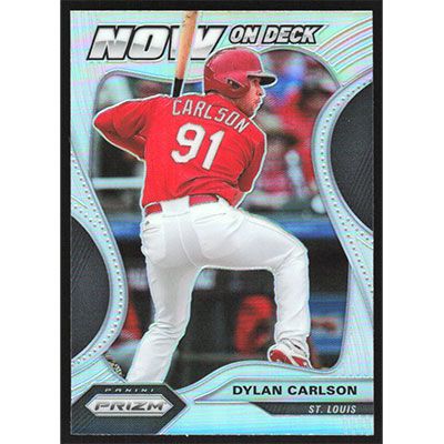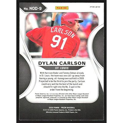 This is a 2020 Panini Prizm Now On Deck Silver Dylan Carlson baseball card. The card is #NOD-9 and pictures show condition. Team(s): St. Louis Cardinals