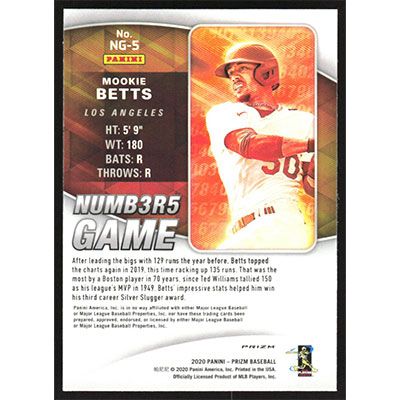 This is a 2020 Panini Prizm Numbers Game Red White and Blue Mookie Betts baseball card. The card is #NG-5 and pictures show condition. Team(s): Los Angeles Dodgers