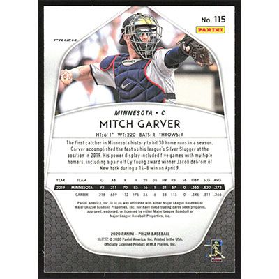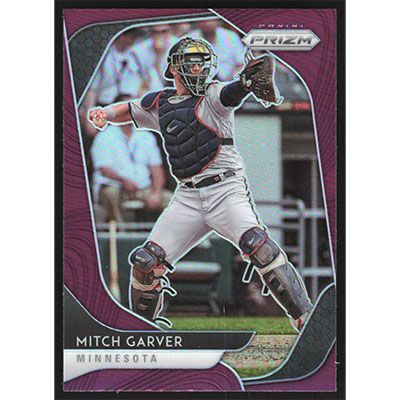 This is a 2020 Panini Prizm Purple Mitch Garver baseball card. The card is #115 and pictures show condition.
