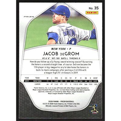 This is a 2020 Panini Prizm Purple Jacob deGrom baseball card. The card is #35 and pictures show condition.