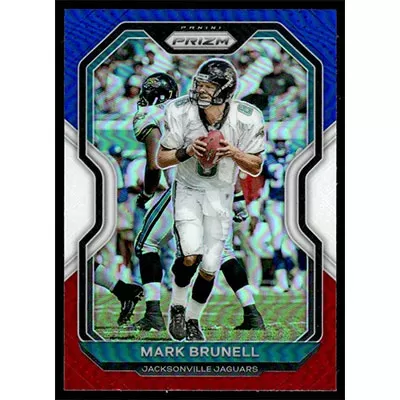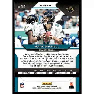 This is a 2020 Panini Prizm Red White and Blue Mark Brunell football card. The card is #100 and pictures show condition.
