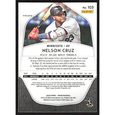 This is a 2020 Panini Prizm Red White and Blue Nelson Cruz baseball card. The card is #103 and pictures show condition.