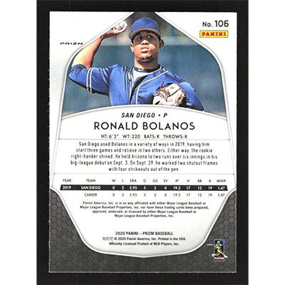 This is a 2020 Panini Prizm Red White and Blue Ronald Bolanos baseball card. The card is #106 and pictures show condition. Team(s): San Diego Padres Rookie Card (RC)