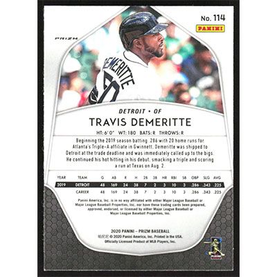 This is a 2020 Panini Prizm Red White and Blue Travis Demeritte baseball card. The card is #114 and pictures show condition. Team(s): Detroit Tigers Rookie Card (RC)