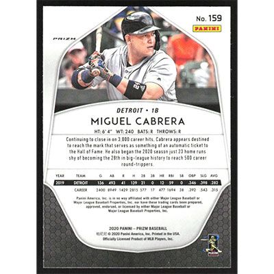This is a 2020 Panini Prizm Red White and Blue Miguel Cabrera baseball card. The card is #159 and pictures show condition.