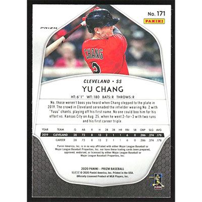 This is a 2020 Panini Prizm Red White and Blue Yu Chang baseball card. The card is #171 and pictures show condition. Team(s): Cleveland Indians Rookie Card (RC)