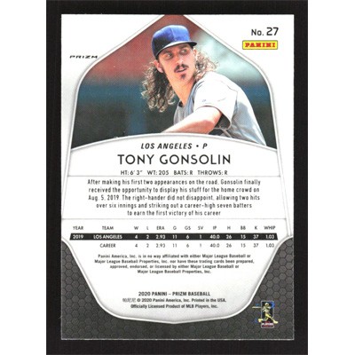 This is a 2020 Panini Prizm Red White and Blue Tony Gonsolin baseball card. The card is #27 and pictures show condition. Team(s): Los Angeles Dodgers Rookie Card (RC)