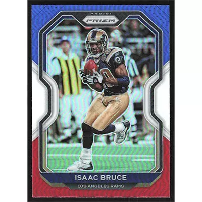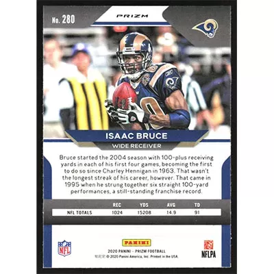 This is a 2020 Panini Prizm Red White and Blue Isaac Bruce football card. The card is #280 and pictures show condition.