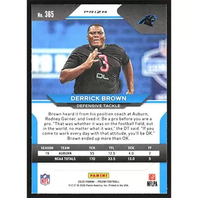 This is a 2020 Panini Prizm Red White and Blue Derrick Brown football card. The card is #365 and pictures show condition. Team(s): Carolina Panthers Rookie Card (RC)