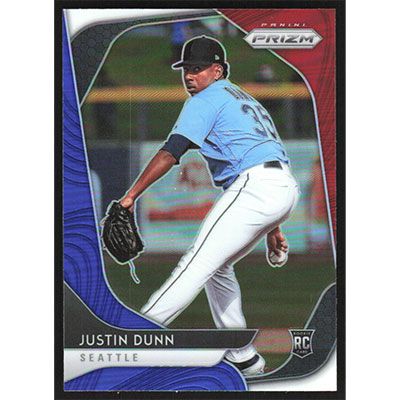 This is a 2020 Panini Prizm Red White and Blue Justin Dunn baseball card. The card is #44 and pictures show condition. Team(s): Seattle Mariners Rookie Card (RC)