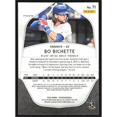 This is a 2020 Panini Prizm Red White and Blue Bo Bichette baseball card. The card is #71 and pictures show condition. Team(s): Toronto Blue Jays Rookie Card (RC)