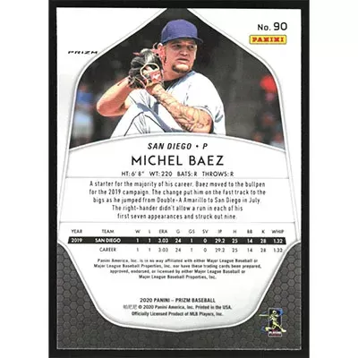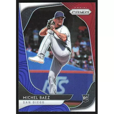 This is a 2020 Panini Prizm Red White and Blue Michel Baez baseball card. The card is #90 and pictures show condition. Team(s): San Diego Padres Rookie Card (RC)