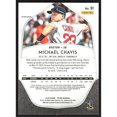 This is a 2020 Panini Prizm Red White and Blue Michael Chavis baseball card. The card is #91 and pictures show condition.