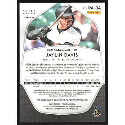 This is a 2020 Panini Prizm Rookie Autographs Red White and Blue Jaylin Davis autographed baseball card. This card has been signed, in blue, by Jaylin Davis, and is certified authentic by Panini. The card is #RA-DA and pictures show condition. This card is limited; #'d 38/50.