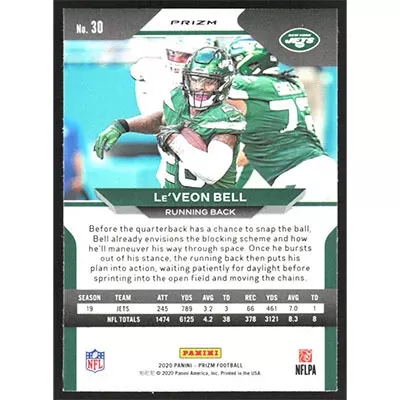 This is a 2020 Panini Prizm Silver Le'Veon Bell football card. The card is #30 and pictures show condition.
