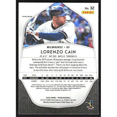 This is a 2020 Panini Prizm Silver Lorenzo Cain baseball card. The card is #32 and pictures show condition.