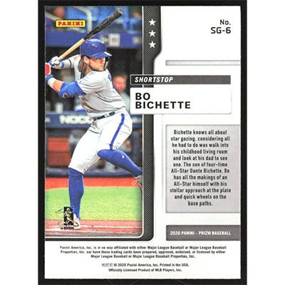 This is a 2020 Panini Prizm Star Gazing Bo Bichette baseball card. The card is #SG-6 and pictures show condition.