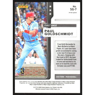 This is a 2020 Panini Prizm Star Gazing Silver Paul Goldschmidt baseball card. The card is #SG-7 and pictures show condition. Team(s): St. Louis Cardinals