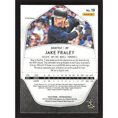This is a 2020 Panini Prizm Teal Wave Jake Fraley baseball card. The card is #19 and pictures show condition. Team(s): Seattle Mariners Rookie Card (RC)