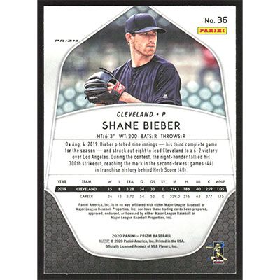 This is a 2020 Panini Prizm Teal Wave Shane Bieber baseball card. The card is #36 and pictures show condition.