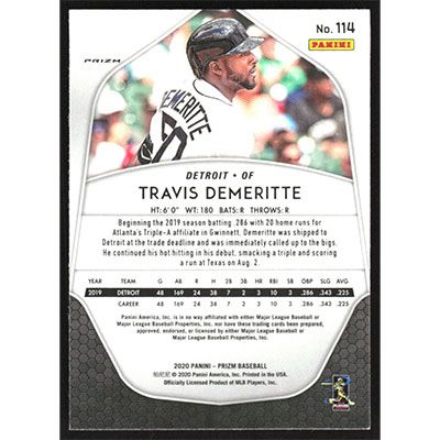 This is a 2020 Panini Prizm White Wave Travis Demeritte baseball card. The card is #114 and pictures show condition. Team(s): Detroit Tigers Rookie Card (RC)