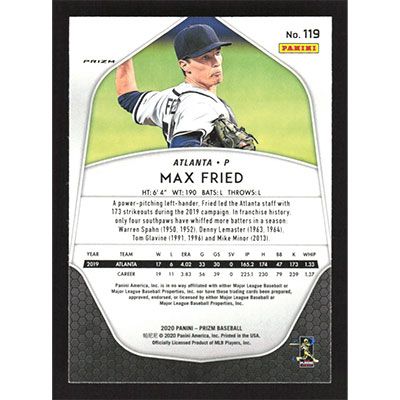 This is a 2020 Panini Prizm White Wave Max Fried baseball card. The card is #119 and pictures show condition.