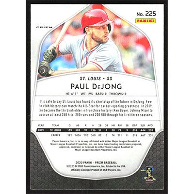 This is a 2020 Panini Prizm White Wave Paul DeJong baseball card. The card is #225 and pictures show condition.