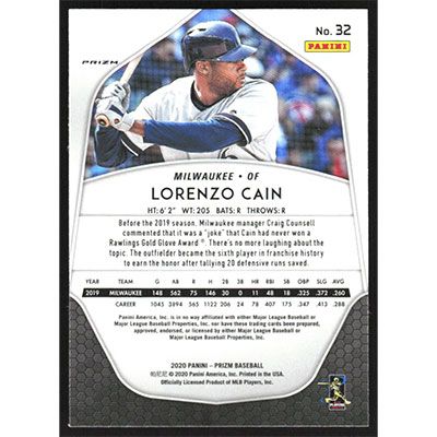 This is a 2020 Panini Prizm White Wave Lorenzo Cain baseball card. The card is #32 and pictures show condition.