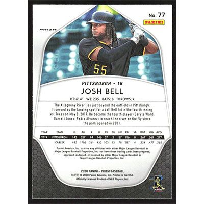 This is a 2020 Panini Prizm White Wave Josh Bell baseball card. The card is #77 and pictures show condition.