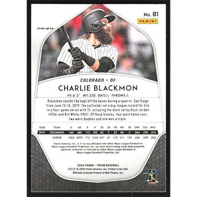 This is a 2020 Panini Prizm White Wave Charlie Blackmon baseball card. The card is #81 and pictures show condition.
