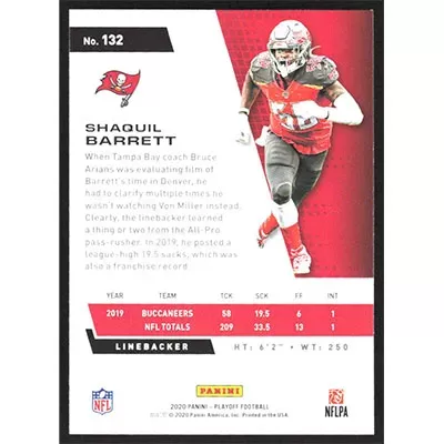 This is a 2020 Playoff Shaquil Barrett football card. The card is #132 and pictures show condition.