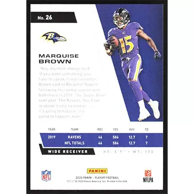 This is a 2020 Playoff Marquise Brown football card. The card is #26 and pictures show condition.