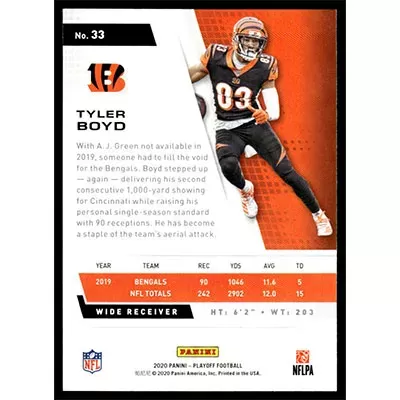 This is a 2020 Playoff Tyler Boyd football card. The card is #33 and pictures show condition.
