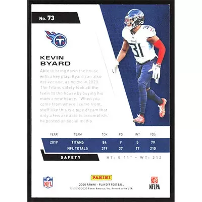 This is a 2020 Playoff Kevin Byard football card. The card is #73 and pictures show condition.