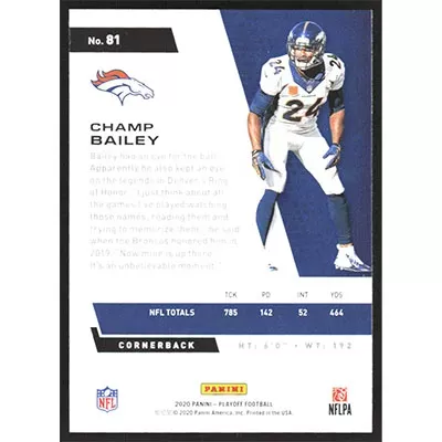 This is a 2020 Playoff Champ Bailey football card. The card is #81 and pictures show condition.