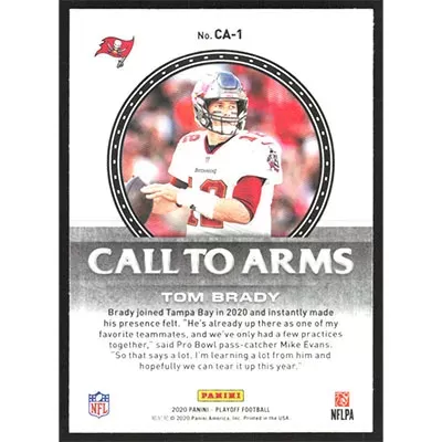 This is a 2020 Playoff Call to Arms Tom Brady football card. The card is #CA-1 and pictures show condition.