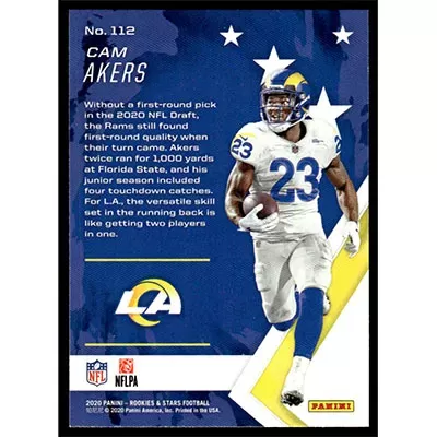 This is a 2020 Rookies & Stars Cam Akers football card. The card is #112 and pictures show condition.