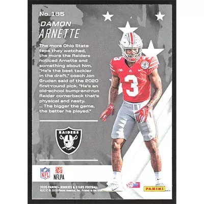 This is a 2020 Rookies & Stars Damon Arnette football card. The card is #185 and pictures show condition.