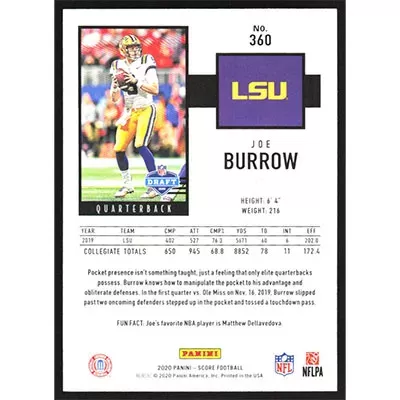 This is a 2020 Score Joe Burrow football card. The card is #360 and pictures show condition.