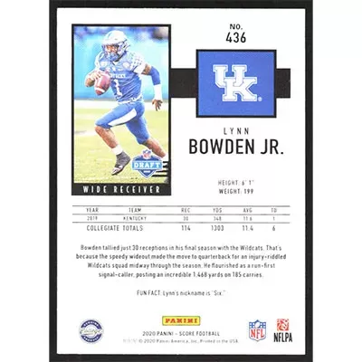 This is a 2020 Score Lynn Bowden Jr. football card. The card is #436 and pictures show condition.