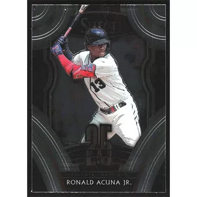 This is a 2020 Select 25-Man Ronald Acuña Jr. baseball card. The card is #25M-B4 and pictures show condition.