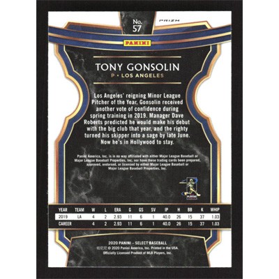 This is a 2020 Select Prizms Scope Tony Gonsolin baseball card. The card is #57 and pictures show condition. Team(s): Los Angeles Dodgers Rookie Card (RC)