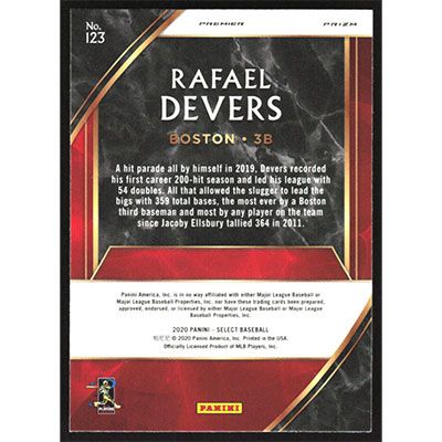 This is a 2020 Select Scope Rafael Devers Premier baseball card. The card is #123 and pictures show condition.