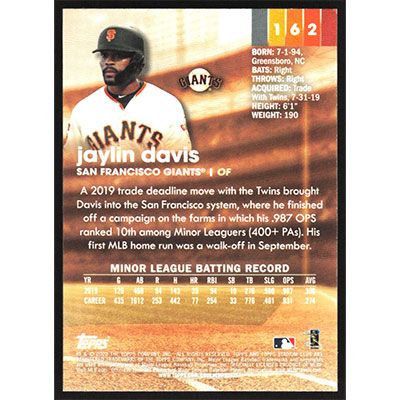 This is a 2020 Stadium Club Jaylin Davis baseball card. The card is #162 and pictures show condition. Team(s): San Francisco Giants Rookie Card (RC)