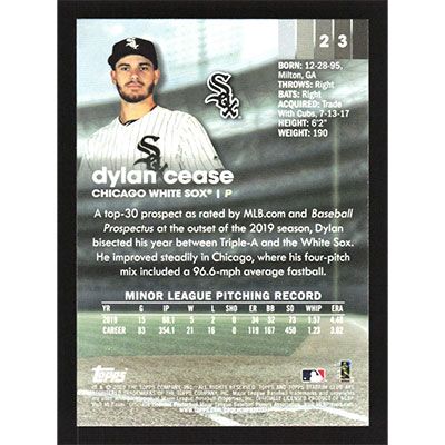 This is a 2020 Stadium Club Dylan Cease baseball card. The card is #23 and pictures show condition.