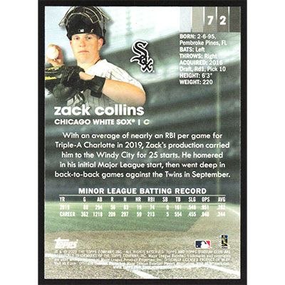 This is a 2020 Stadium Club Zack Collins baseball card. The card is #72 and pictures show condition.