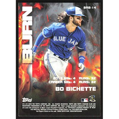 This is a 2020 Stadium Club Bash & Burn Bo Bichette baseball card. The card is #BAB-14 and pictures show condition. Team(s): Toronto Blue Jays Rookie Card (RC)