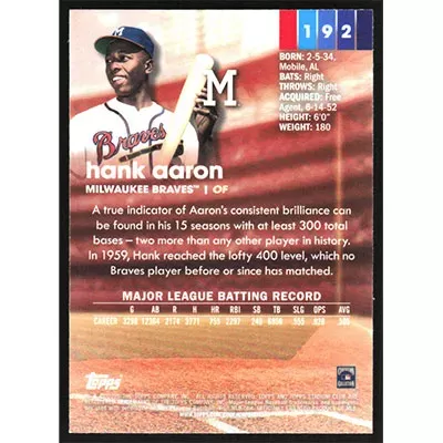 This is a 2020 Stadium Club Chrome Hank Aaron baseball card. The card is #192 and pictures show condition.
