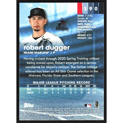 This is a 2020 Stadium Club Chrome Robert Dugger baseball card. The card is #390 and pictures show condition.